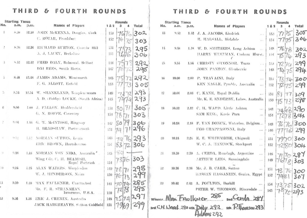 Start times for the final day at Portrush in 1951. Max 9.30am, 1.30pm. Cerda 10.30am, 2.30pm